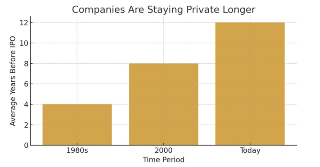 This chart shows the average number of years before a company IPOs. As you can see, in the 1980s, companies went public after about four years. By the early 2000s, that number had doubled to around eight years. Today, companies are staying private for twelve to sixteen years.